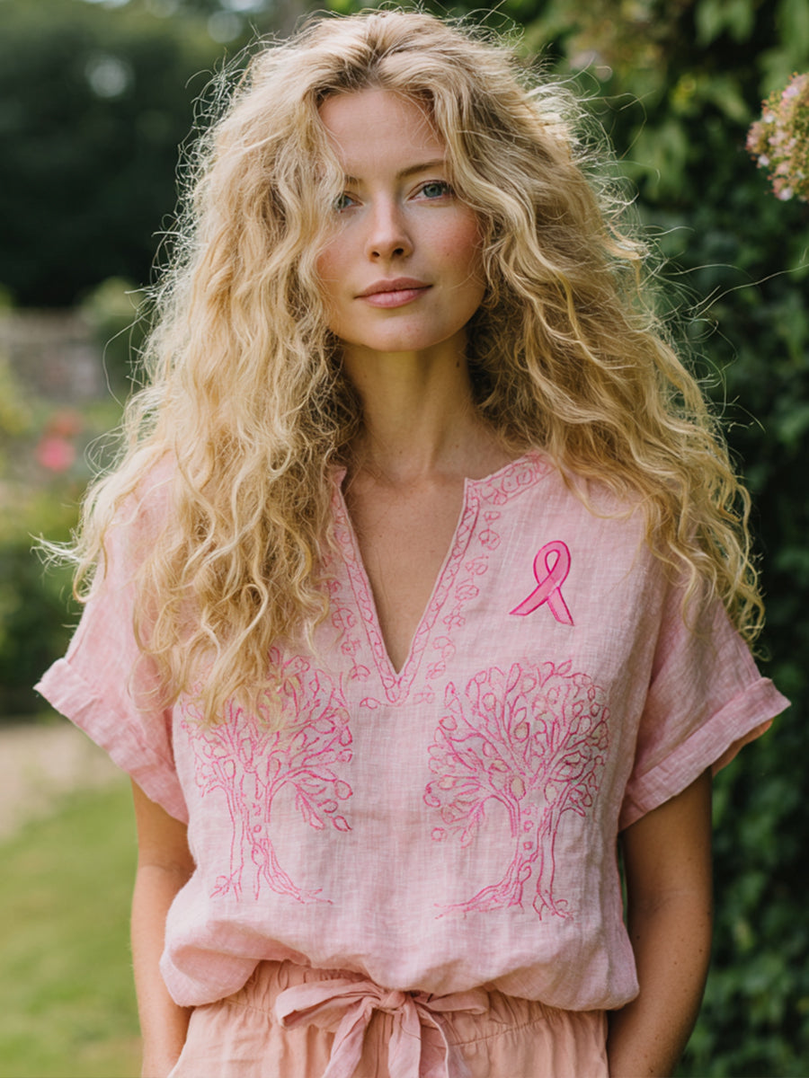 Damen rosa Band & Baum Besticktes Leinen hemd