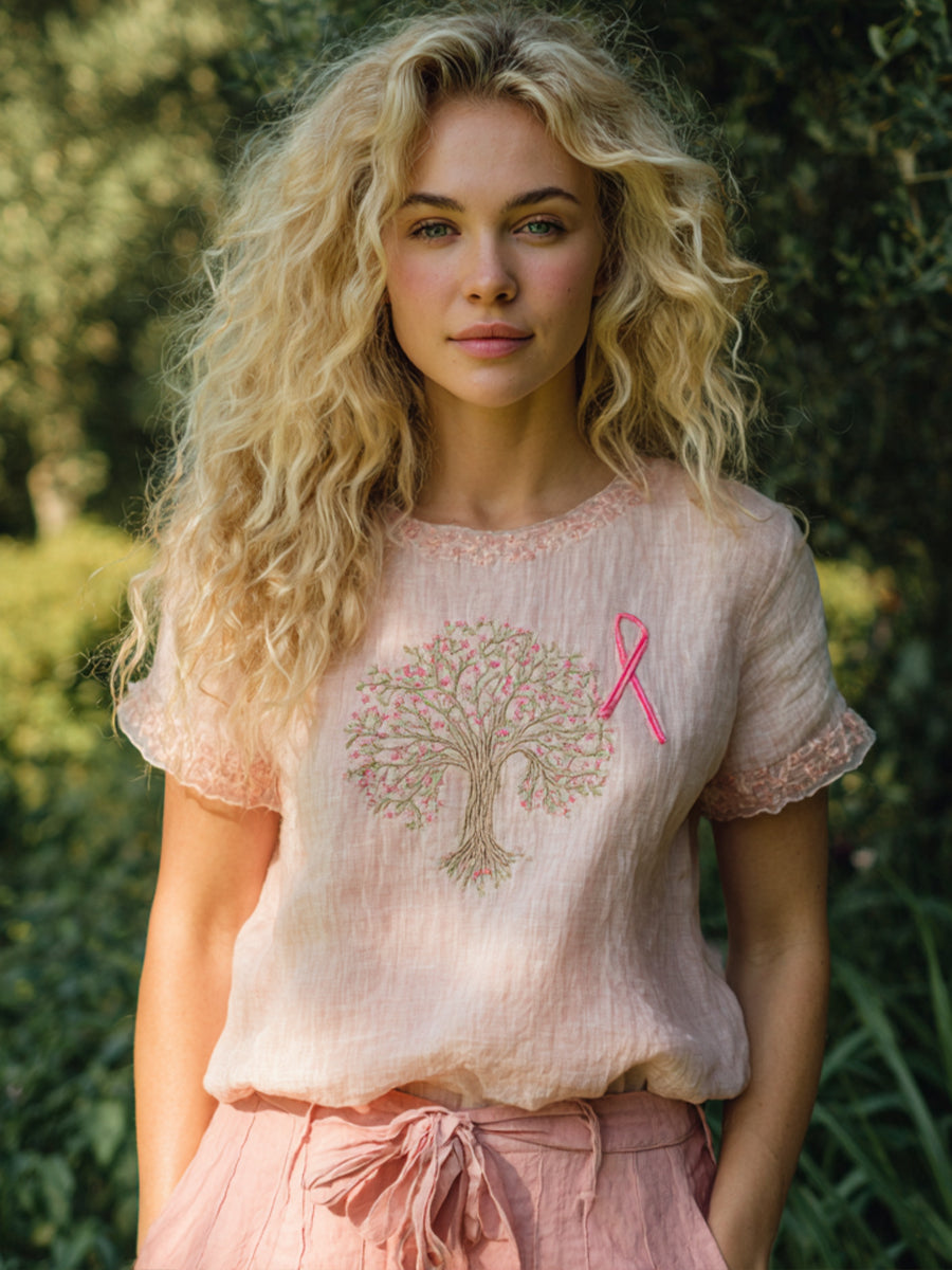 Damen rosa Band & Baum Besticktes Leinen hemd