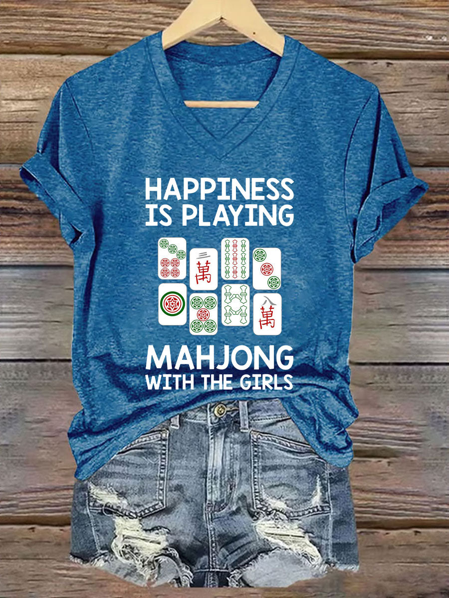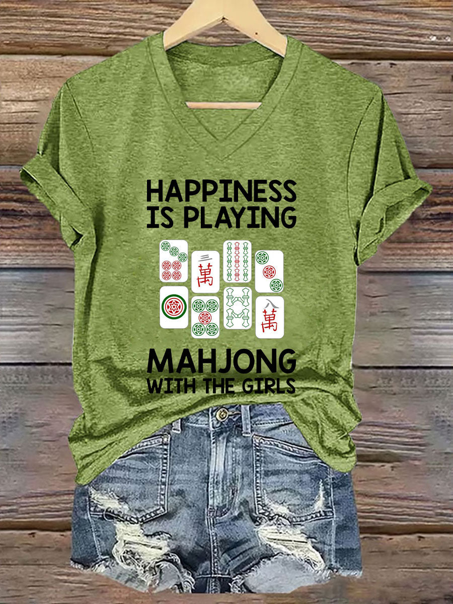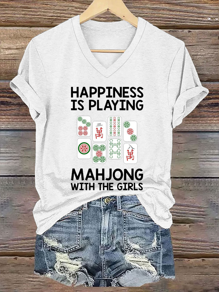 Frauen glück spielt Mahjong mit dem Mädchen T-Shirt mit V-Ausschnitt