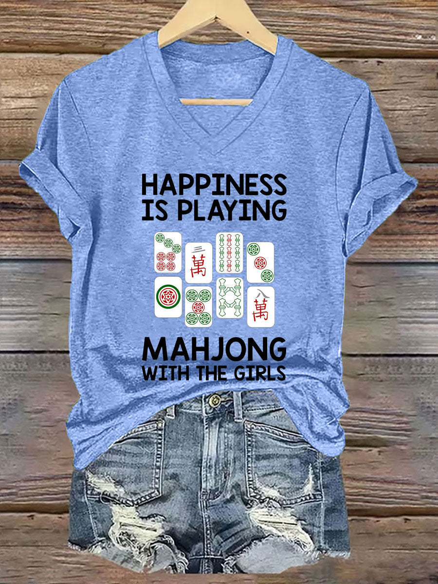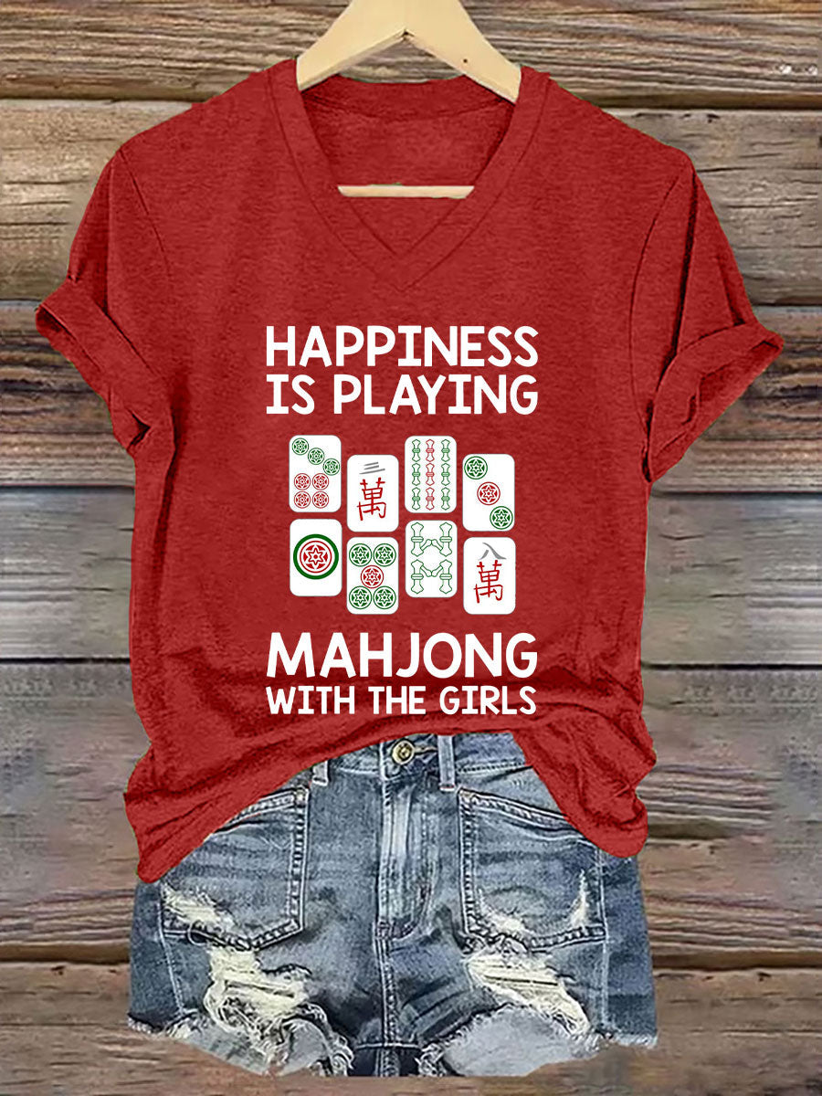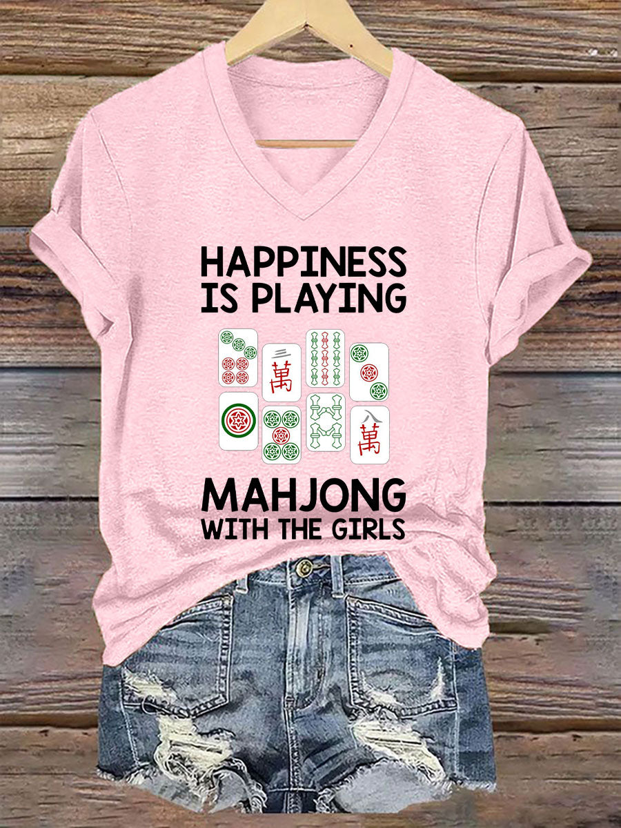 Frauen glück spielt Mahjong mit dem Mädchen T-Shirt mit V-Ausschnitt