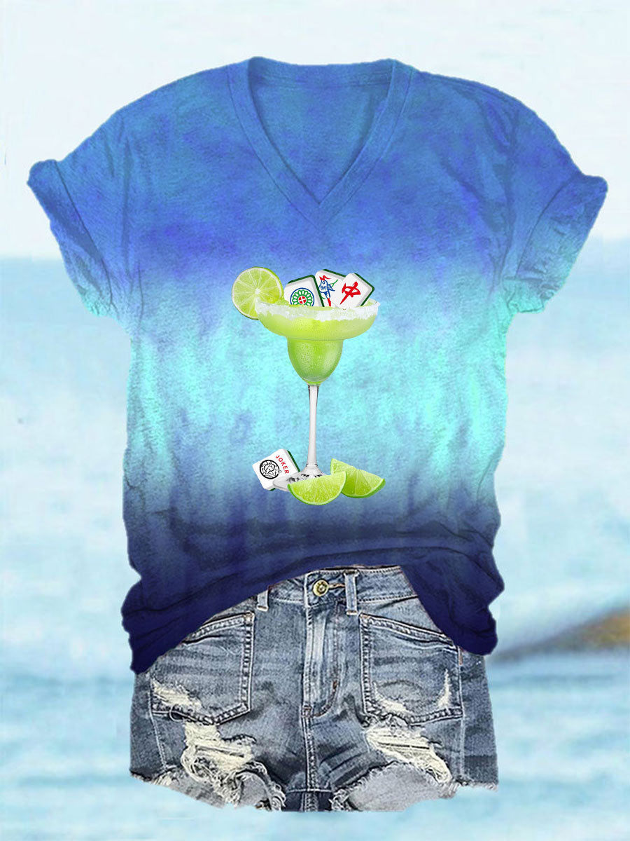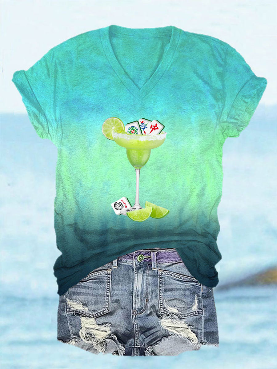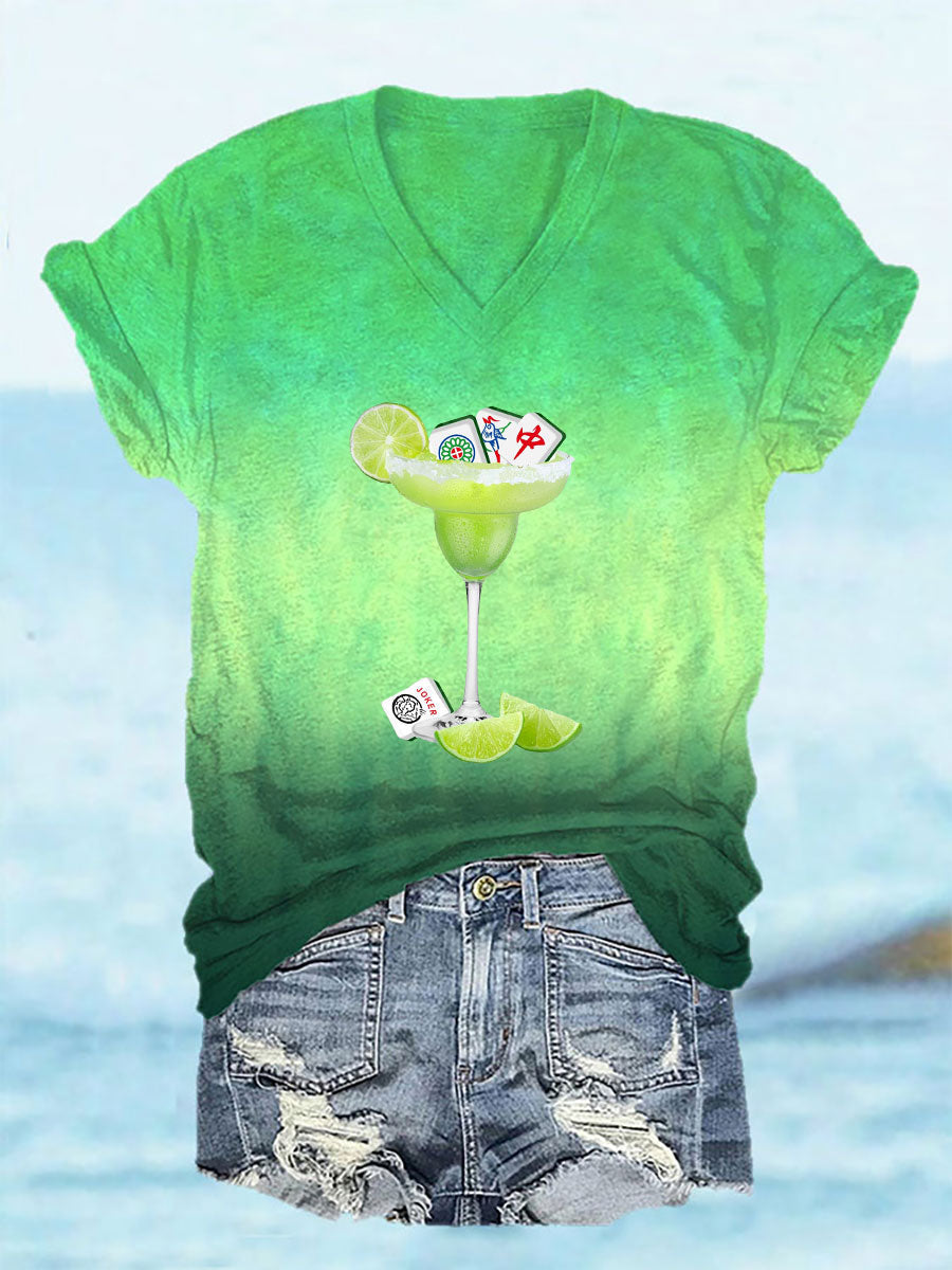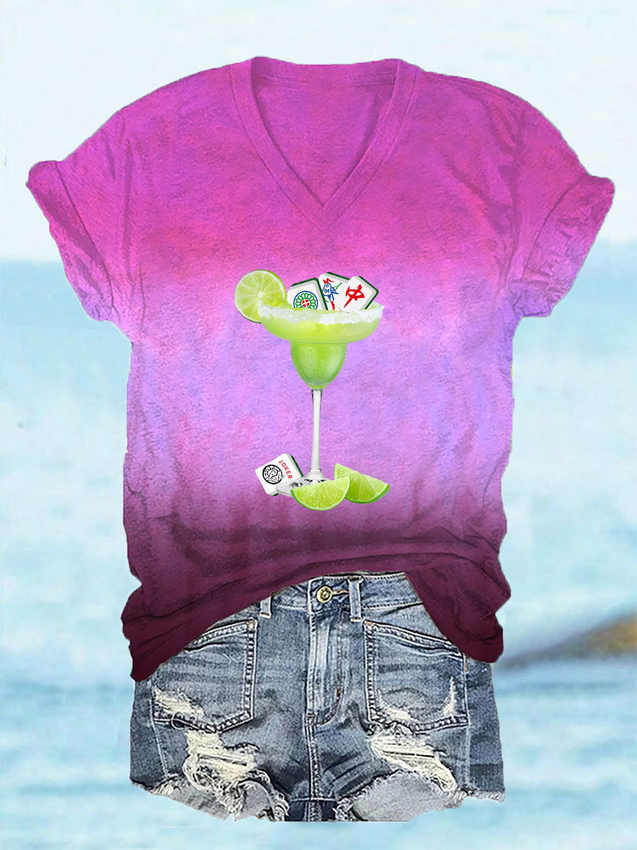 Frauen Lustiges Mahjong-Print V-Ausschnitt T-Shirt