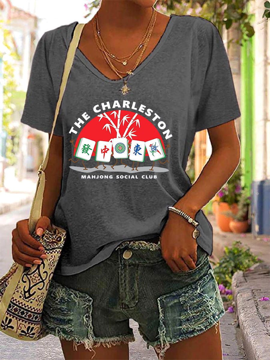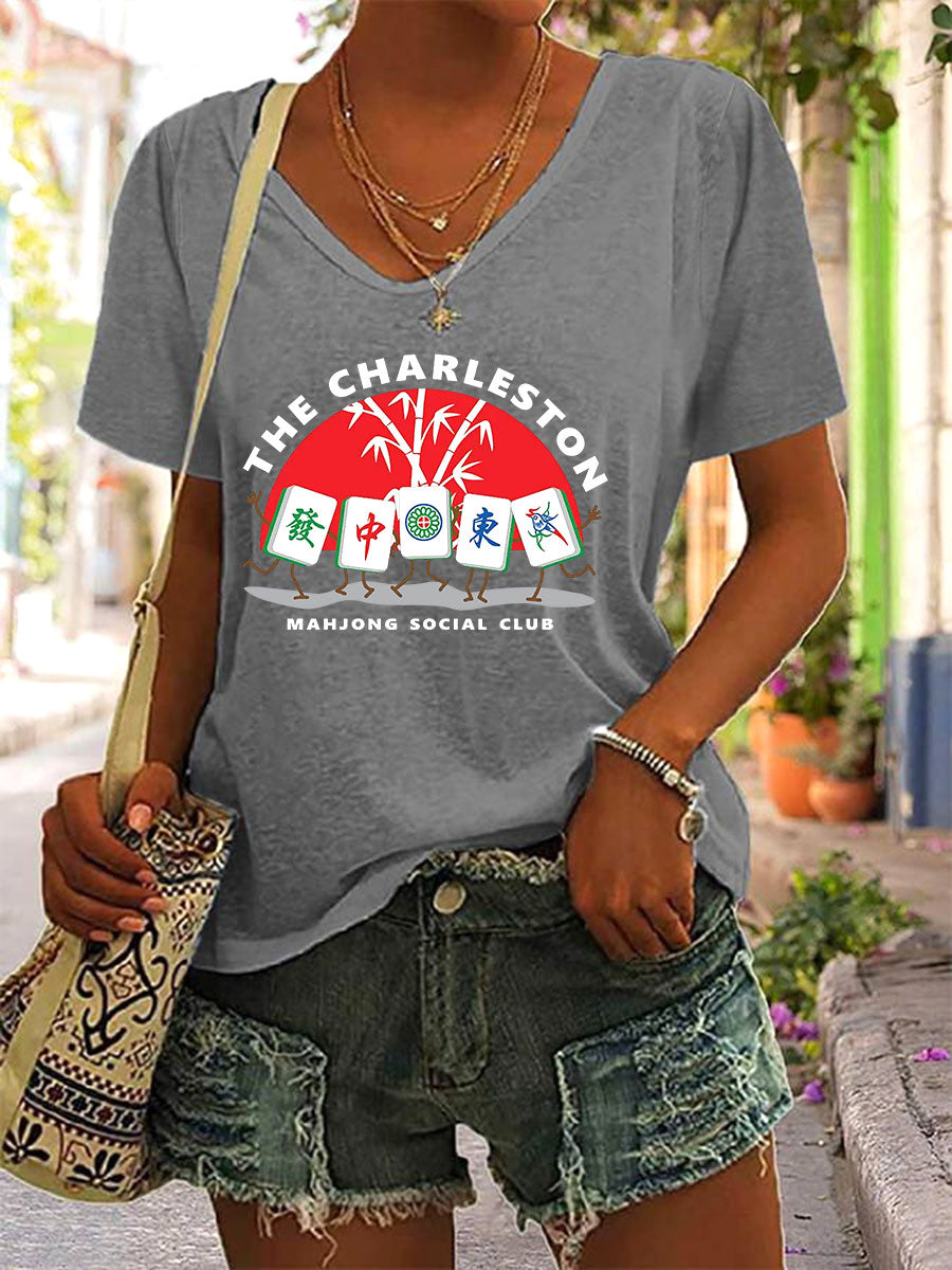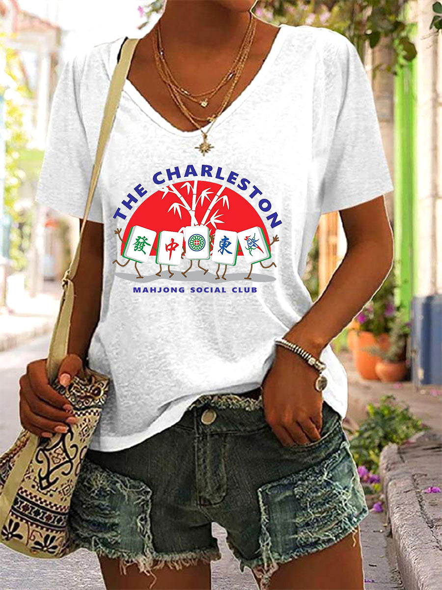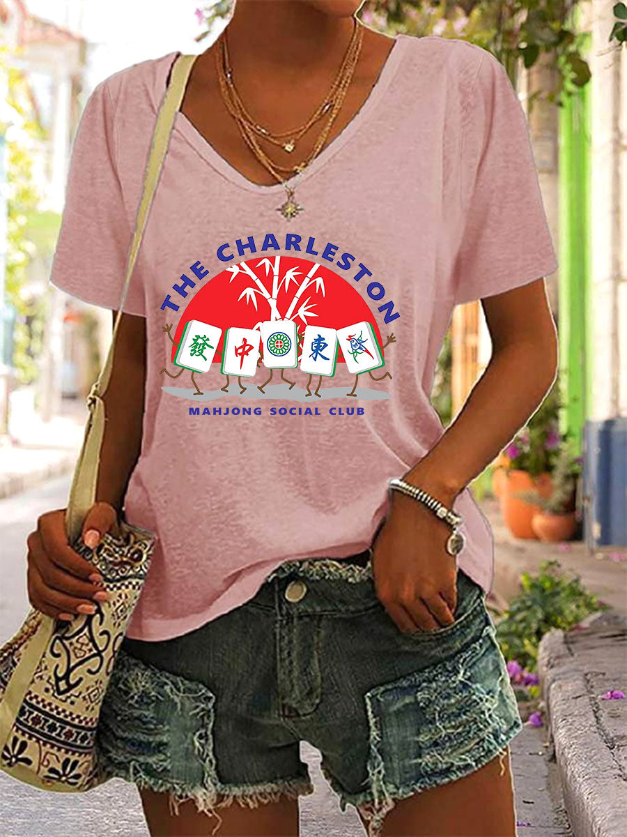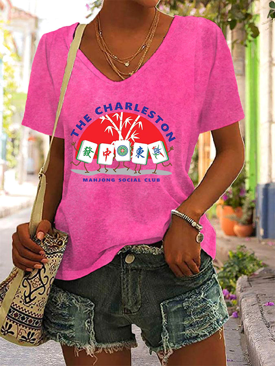 Frauen Mahjong Print V-Ausschnitt T-Shirt