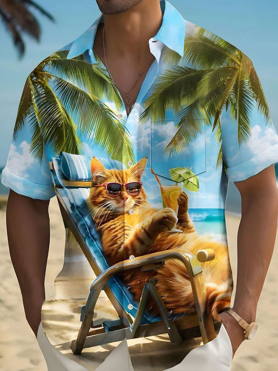 Herren lustige Katze Kokosnuss baum Kurzarm Sommer Hawaiian Shirt